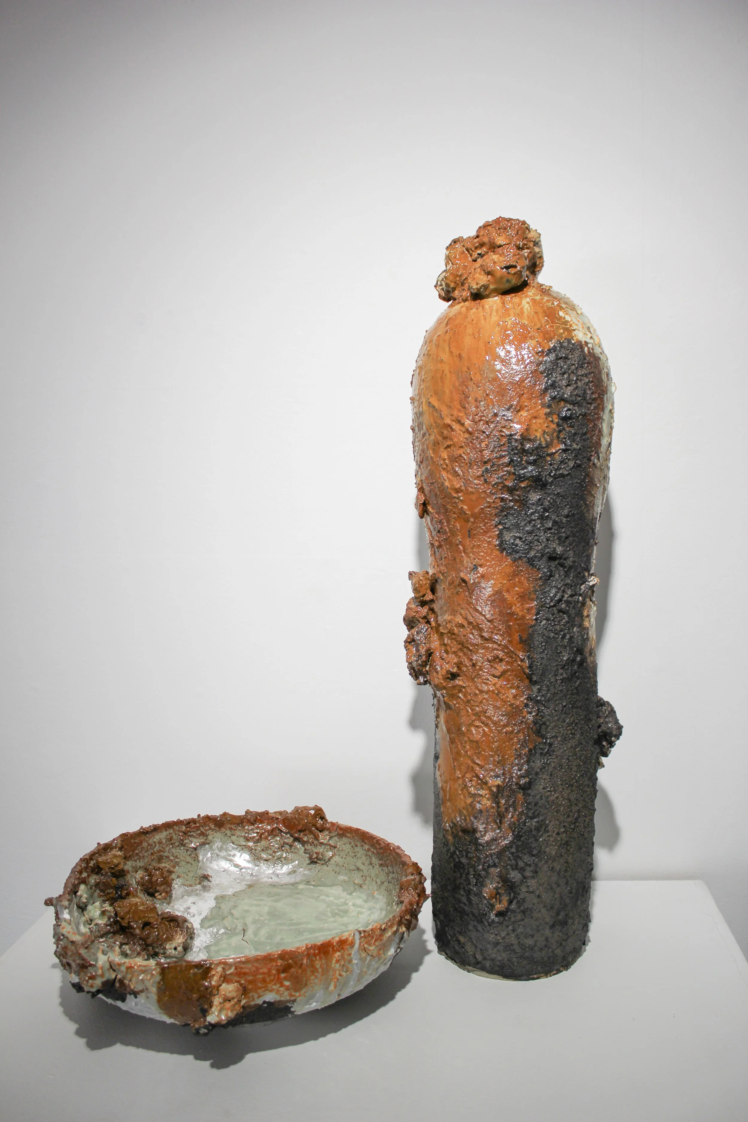 Narcissus: Grief continues an exploration of how the landscape holds, heals and hinders memory. Drawing on historical allusions to Narcissus, the installation of vessels furthers this narrative in examining the complexity of memories of grief and the potential for continued reflection to consume us. The glazed surfaces marry colours reminiscent of the represented landscapes with the reflective surface of the silver gilded bowl – a symbol of reflection and the pool of Narcissus’ demise.